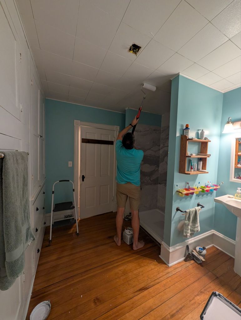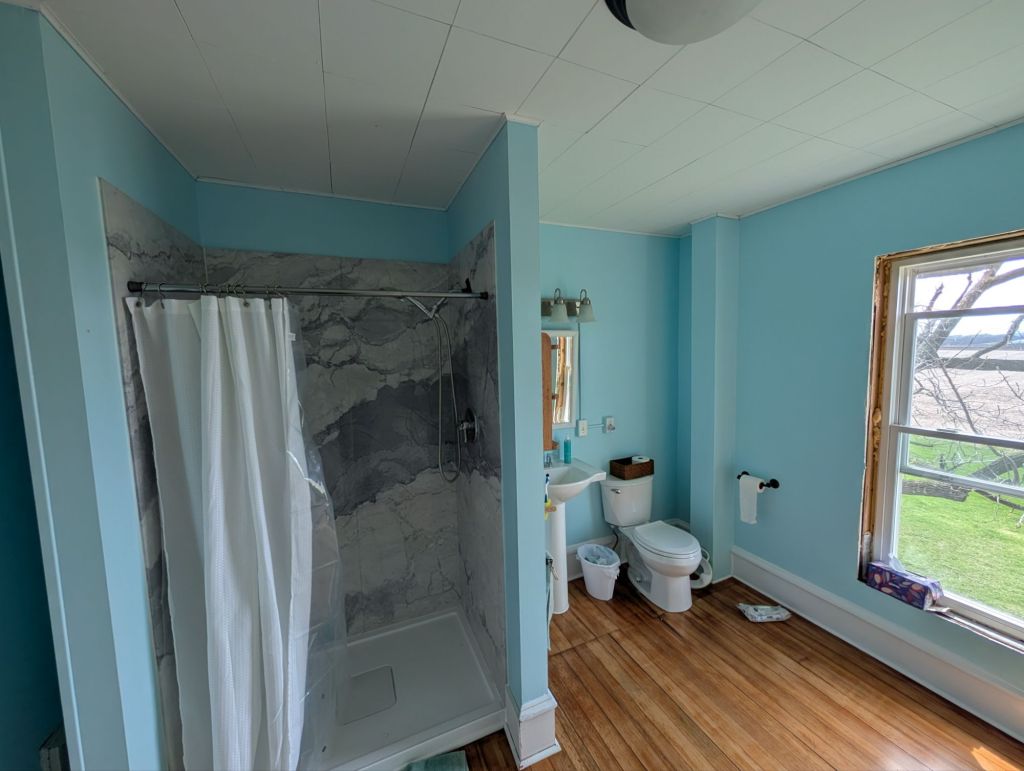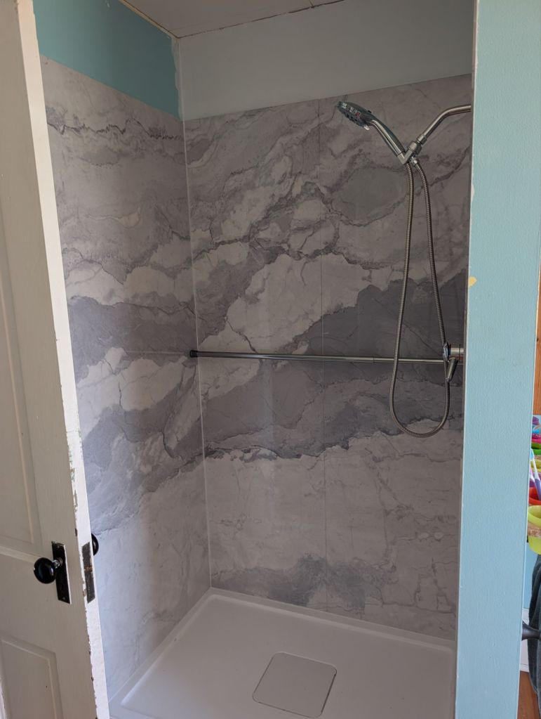 Then as he tried to install the stone he discovered the walls weren’t square. Should have known, right? Old houses are never squared up! It took some effort and some good advice from a contractor that installs this product frequently (thank you!) but we got the shower in. Then because of the different size we had to do some sheetrock work so we had to paint. I had been meaning to paint that bathroom for quite a while anyway so I actually had the paint.