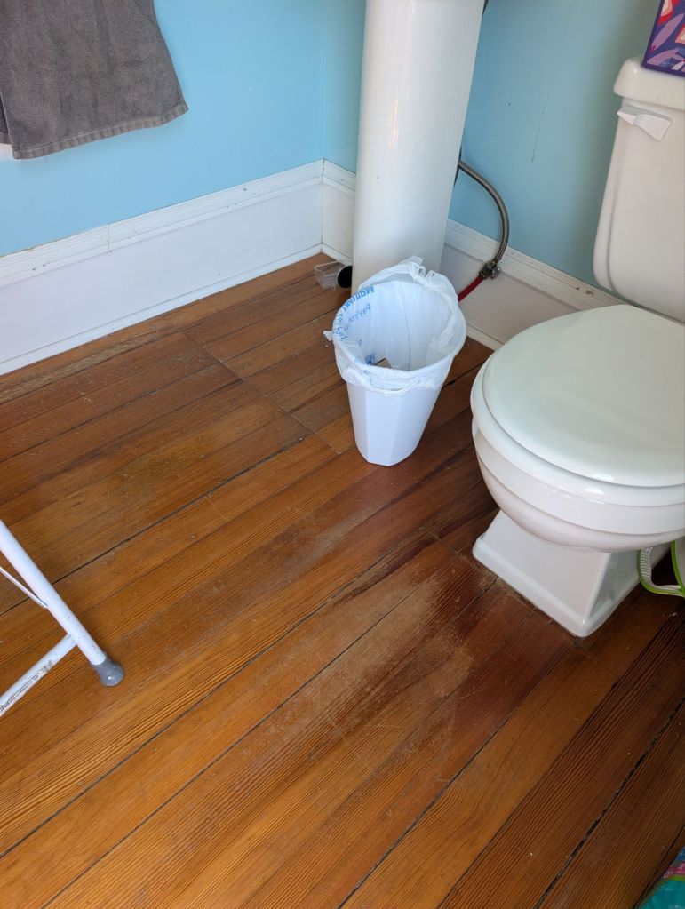As we were going to replace the toilet, we noticed the floor was in pretty bad shape. It’s a wood floor, probably because this room didn’t used to be a bathroom when the house was first built. We didn’t want to cover the wood floor but it needed some protection.