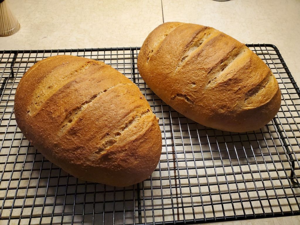 At the 90 minute mark, make 1/4″ deep slices in the top of the loaf, slide the dough AND parchment paper onto the baking stone. Pour 1 cup of water into the cookie sheet and shut the oven quickly. This will produce some steam to crisp the crust.