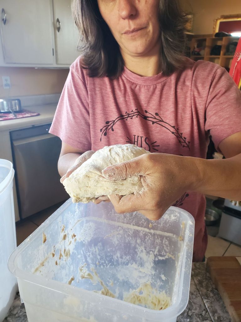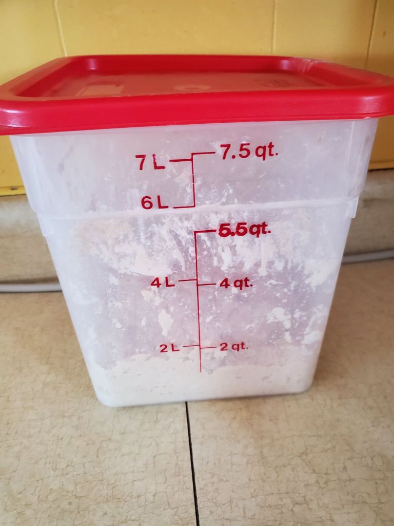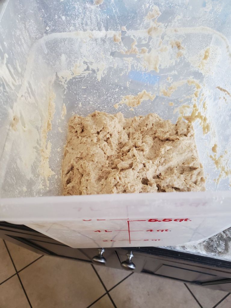 Mix this all together in your food safe container until just evenly moistened. I use my hands at the end to get it fully mixed – be warned! It’s sticky! Don’t knead. Cover with the lid but not airtight and let it sit for 2 hours on the counter. It should rise and then begin to collapse. Then stick it in the fridge. Don’t seal the lid on tight!