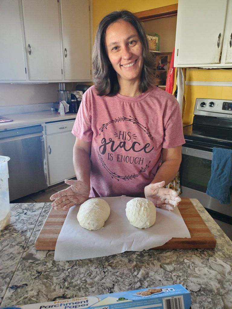When you want to make bread (which is easiest after it’s sat for at least 24 hours) pull your dough out of the fridge. Sprinkle it with flour and rub your hands with flour. Pull up a good handful of dough, about the size of a grapefruit. You can weigh it if you want; it should be about 1 pound. I don’t bother – I just eyeball it.